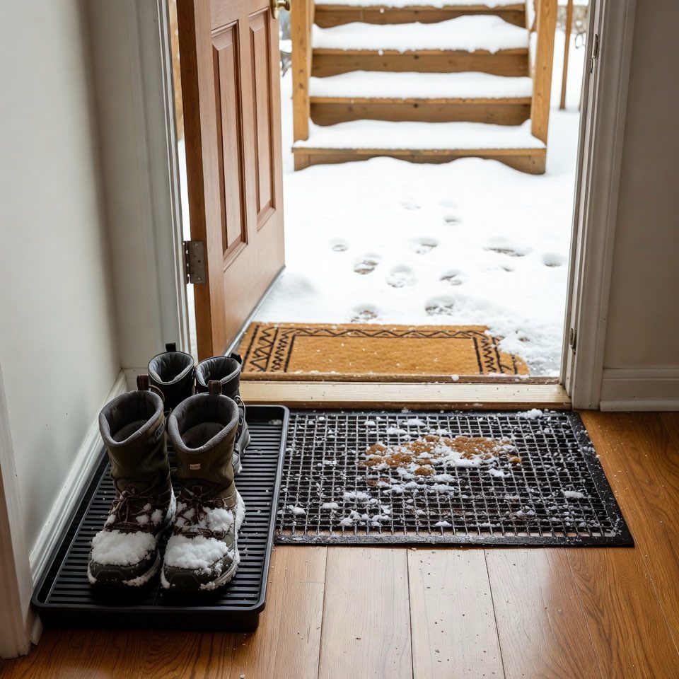 Salt is one of the biggest winter cleaning challenges in Minnesota homes. A simple way to reduce damage is to place a sturdy mat or boot tray both outside and inside the entryway. This creates a double barrier that catches salt before it reaches your floors.